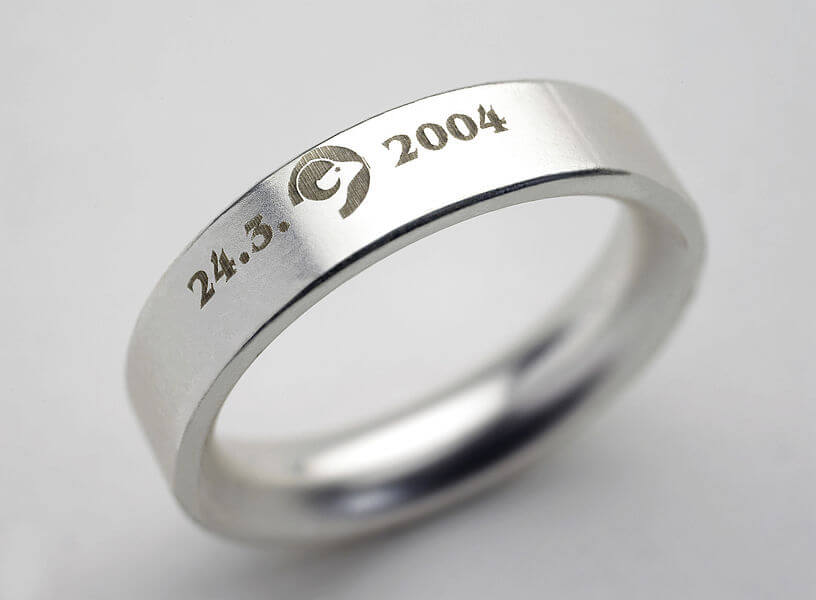 Anillos de compromiso, alianzas matrimoniales o anillos de moda con nombres, fechas o mensajes grabados en el interior o exterior.