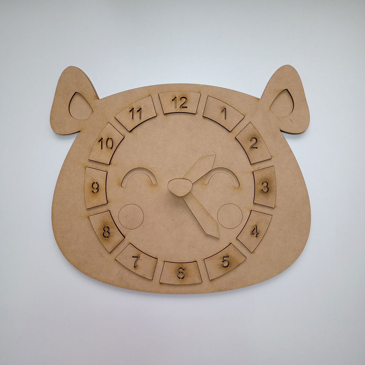 Relojes de madera con números y diseños especiales para aprender a leer la hora.